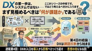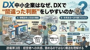 DXの第一歩は、システム導入ではない。まず見極めるべきは何が課題かである 前回は、中小企業がDXで間違った判断をしやすい理由を見てきた。それは、経営者の能力不足でも、現場の感情的な抵抗でもなかった。本当に問題だったのは、 […]