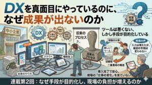 そのツール、本当に必要ですか。問題は製品ではなく導入の順番にある 前回は、DXを進めているのに現場が変わらない、という違和感から話を始めた。ツールは入っている。説明もされている。一応、使ってもいる。それなのに、仕事の骨格 […]